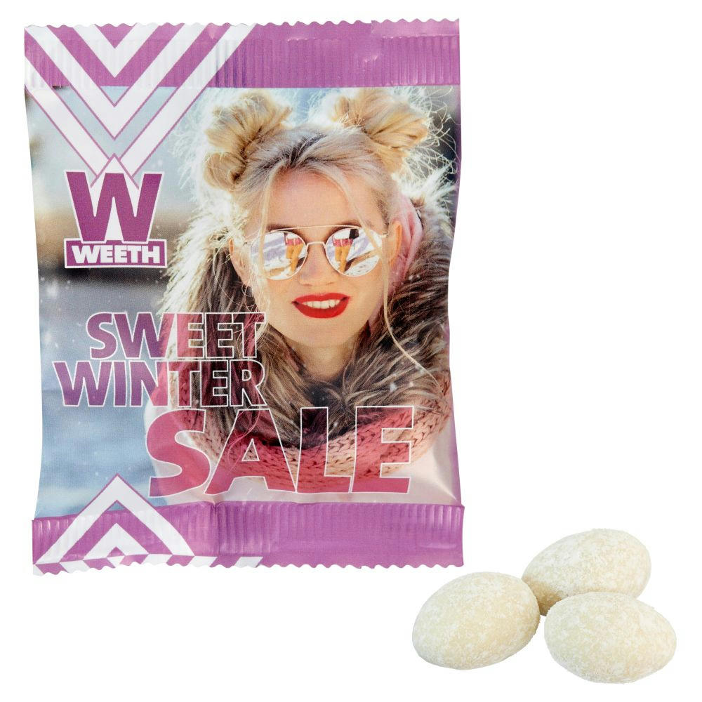 Feine Mandeln dragiert mit 74 % weißer Schokolade mit Vanillegeschmack, umhüllt mit Puderzucker, in weißem Werbetütchen verpackt. Inhalt: ca. 12 g. Maße: ca. 10 x 7,5 cm. Haltbarkeit: ca. 6 Monate. Preis inkl. 1-4c-Druck