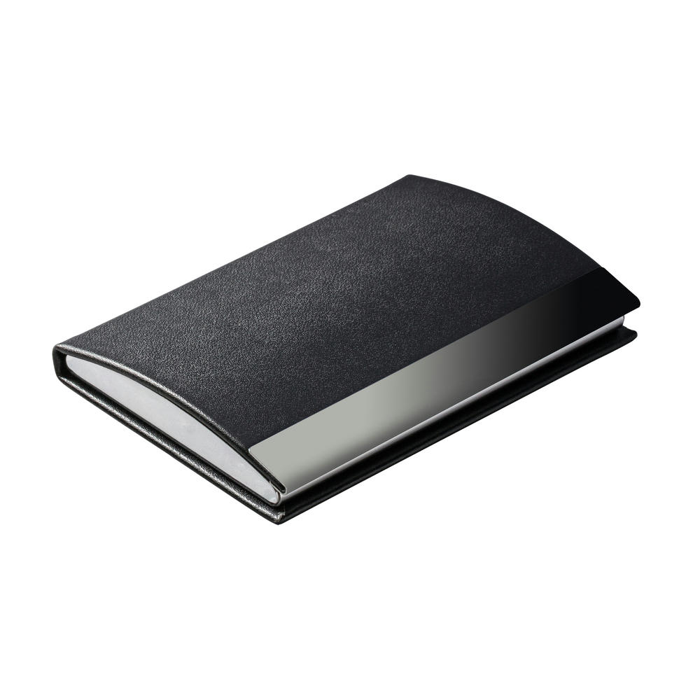 Stilvolles, geschwungenes Visitenkartenetui in schwarzem Kunstleder mit Gunmetal-Plattierung, ergänzt durch einen hochwertigen Magnetverschluss. Der edle Hingucker liegt angenehm in der Hand. Je nach Papiergrammatur ist das Etui für circa 15 Visitenkarten