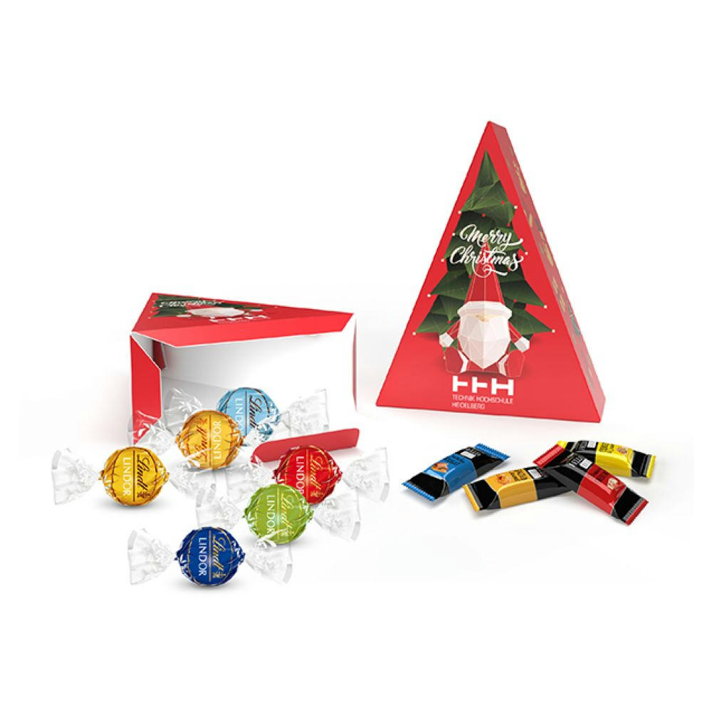 Der hübsche Weihnachtsbaum aus FSC-zertifiziertem Karton ist gefüllt mit 6 Lindt Lindor Kugeln oder 8 Lindt Hello Mini Sticks. Die Kartonage ist rundum außen individuell veredelbar. Weihnachtsbaum | Lindt Lindor Kugel | 4c Euroskala