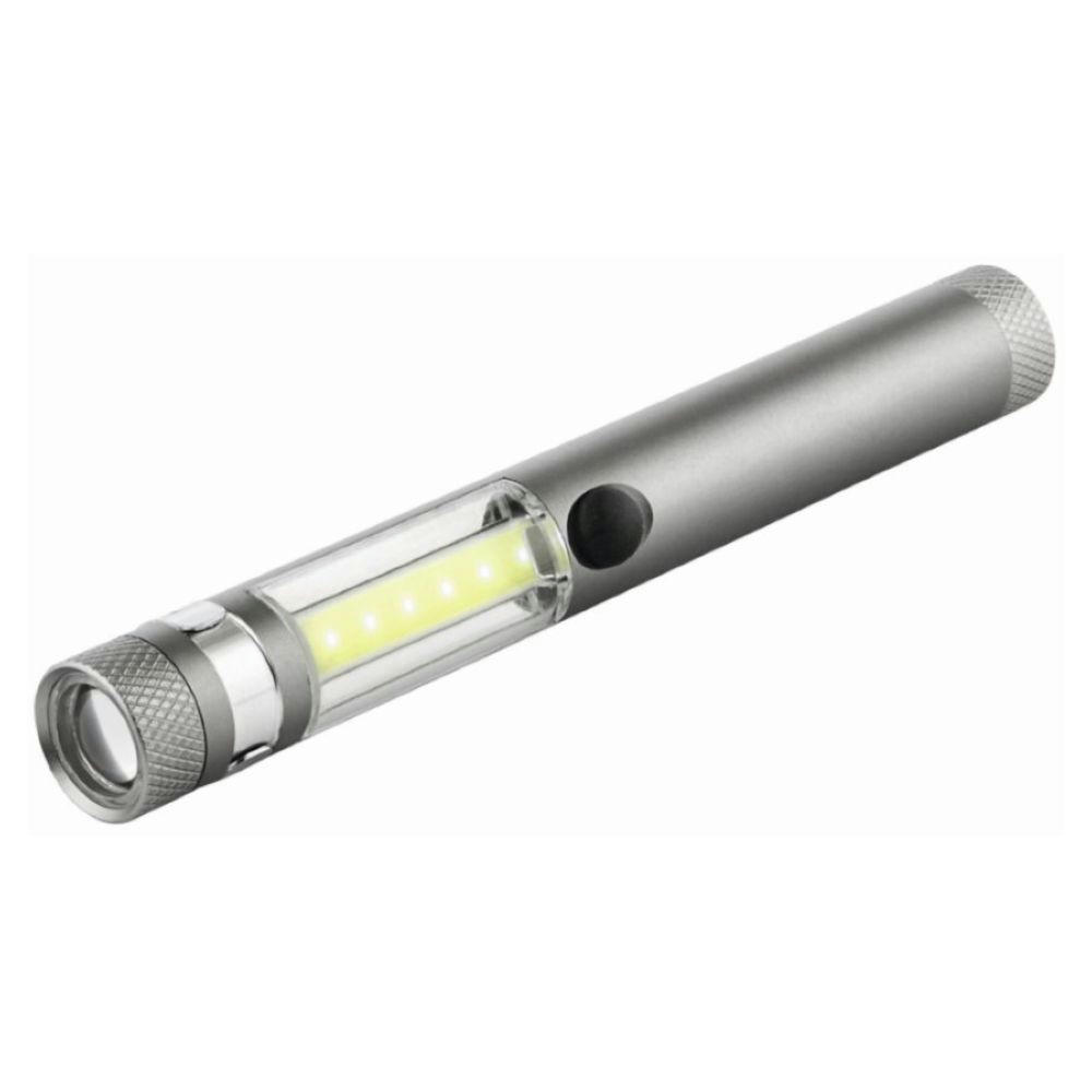 Mittelgroße Alu-Worklight mit Eco-Watt-LED Frontscheinwerfer und COB Arbeitslicht. COB Technologie, spritzwasser-/ überspannungsgeschützt. Magnetfuß, Clip, 1 AAA Batterien, Designkarton
